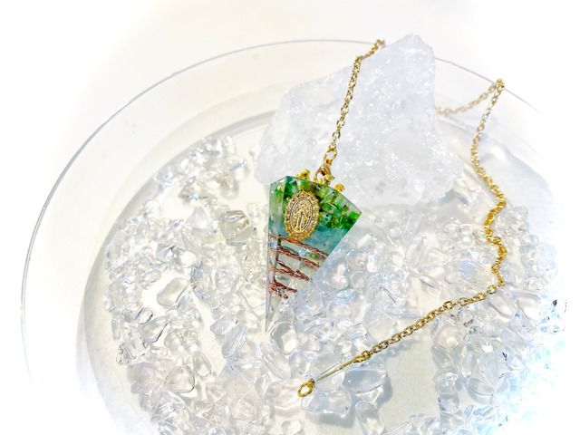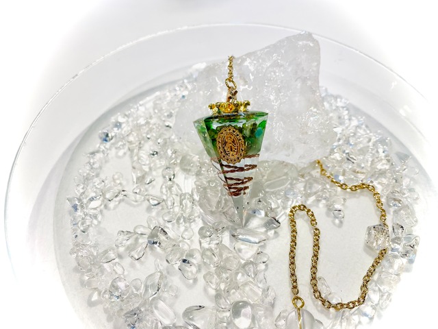 【六角錐オルゴナイトペンデュラム】B (アベンチュリン&ペリドット) 新しくリニューアルした六角錘ペンデュラムです ★黄変対応品となります テンソルリングのインスピレーションを取り入れ、二重螺旋状にした銅線が入ります 特殊製法を使い、レジンの最高のクリアさを実現しています 是非その美しさを手にしてみてください オリジナルダウジングチャートとペンデュラムが入る専用ポーチ付きなので、持ち運ぶとができます♪ (専用ポーチは予告なく色が変更になる場合がございますので、ご了承ください) 仕様と素材:レジン・螺旋状の銅線を巻いたポイント水晶・真鍮の金属片・天然石のさざれ・オーム のメダイ・専用ポーチ・オリジナルダウジングチャート・クリスタルの波動転写 大きさ:約横2.3㎝×縦3.5cm 六角錘オルゴナイトペンデュラムを何十個も作り、角度や大きさを変えた最終形態 見た目もいい、スタイリッシュな形になりました 【ペンデュラム】 ペンジュラムはダウジング用に使う「振り子」のことです 一般的にはYES/NO方式等で、潜在意識に問いかけて、答えを導き出すツールです 特殊製法を使い、レジンの最高のクリアさを実現しています レジンの透明度と表面の端正さには気をつけて製作しています 是非、その美しさを手に取って見てほしいと思います! 型から起こして製作しているので、とても時間がかかっています 私自身、楽しんで創っています そのエネルギーを感じ取って頂けたら嬉しいです! ★★★★★★★★★★★★★★★★★★★★ 【自分用にセッティング】 1:深呼吸してリラックス、楽しむ気分で始めましょう 2:『YESの時は時計回りに、NOの時は反時計回りに』と動きを自分用に決めてしまい、ペンデュラムを設定してあげます 3:設定を何度か行う ※YESかNOで明確に答えられる質問をするのがポイントです(私は女ですなど) ★★★★★★★★★★★★★★★★★★★★ 【アベンチュリンの意味】 アベンチュリンは森林を思わせる癒しの石 心身やオーラに溜まったエネルギーの汚れを掃除して綺麗にしてくれます そのため、健康維持、促進すると言うことにおいて、とても役立つ石です 【ヒーリング効果】 ○ネガティブな感情や思考の解消 ○地球的なエネルギー ○洞察力を高める ○自律神経を整える ○疲労回復 ○ストレスの緩和 ○健康促進、維持 【ペリドットの意味】 古代の人々は『太陽が爆発して飛んできた石』など『太陽の石』として崇拝してきました ネガティブなエネルギーを取り除き、ポジティブなエネルギーをもたらしてくれます どんな時も明るい希望と、勇気をもたらしてくれますので、マイナスの感情にとらわれやすい人には、身に付けてお守りにすることをお勧めします 【ヒーリング効果】 ○太陽の象徴 ○厄除け ○ポジティブ・ストレスの温和 ○夫婦和合 ○癌の治療薬・肝臓の病気や食欲不振 【水晶の意味】 心身の活性化や潜在能力の開花、直観力や想像力の強化などにも力を貸してくれます。 水晶のパワーは『調和・統合・強化』。 優れた浄化作用により、他のパワーストーンが吸収したマイナスエネルギーや様々な波動を、もとのクリーンな状態に戻してくれます。 【ヒーリング効果】 ○生命力の活性化 ○細胞の再生力・免疫力を高める ○体内に蓄積された毒素の排除 ○開運 ○浄化 【オーム】(ओम् om、または ॐ oṃ〈オーン〉) インドの諸宗教において神聖視される呪文、マントラ 神聖な音を意味し、日本語では「真言」といいます 神格、属性がなく『オーム』は性質のないマントラで、『宇宙を表す音』ともいわれます 発音はAUMですが、この3つの音はそれぞれ、50音の最初の音[A・ア]、最後の音[M・ン]、と中間の[U・ウ]から構成された言葉です 最初の音と最後の音を組み合わせた聖音は世界各国にあり、身近なものだとキリスト教のアーメン、仏教の南無が似ています ★★★★★★★★★★★★★★★★★★★★ 【テンソルリング】 ダウザーのスリム・スパーリングにより発明されました テンソルリングとはキュービット(qubit)を単位とした、特定の長さを持つ銅線をねじって1つの輪に繋げたものです 銅線の長さはパイプオルガンの長さによって音色が変わるのと同じような要領で、特定の長さは特定の周波数(波長)を持っているそうです ワイヤーの両端はポジティブ(陽)、ネガティブ(陰)の極性を持ち、それを環状にすることでエネルギーだけを取り出せるといいます 電子の世界では、増幅器は必ず電磁気の影響でノイズが出ます ノイズをなくすために、極性のある二本の線をねじり線にします これは「同相信号除去(Common Mode Rejection)」として知られた方法です ワイヤーをねじることで電磁波の影響をなくし、ユニークなテンソル場を作ります 【テンソルリングの効果】 宇宙エネルギーを貯めるだけに、さまざまな効能が発見されています 〇ストレス減 〇ケガ、病気の治りが早くなる 〇EMF(超低周波電磁波)による影響の軽減 〇水の活性化