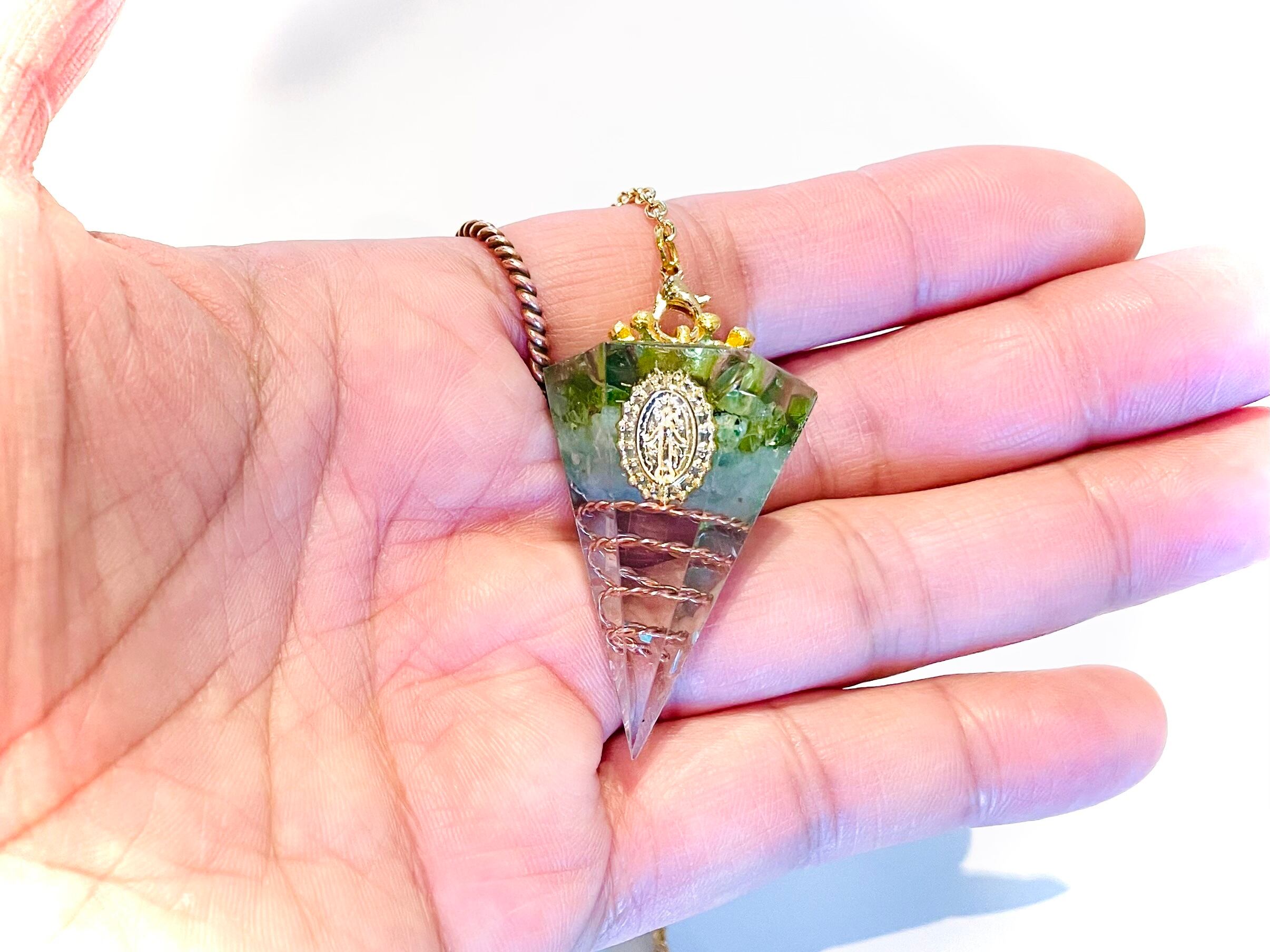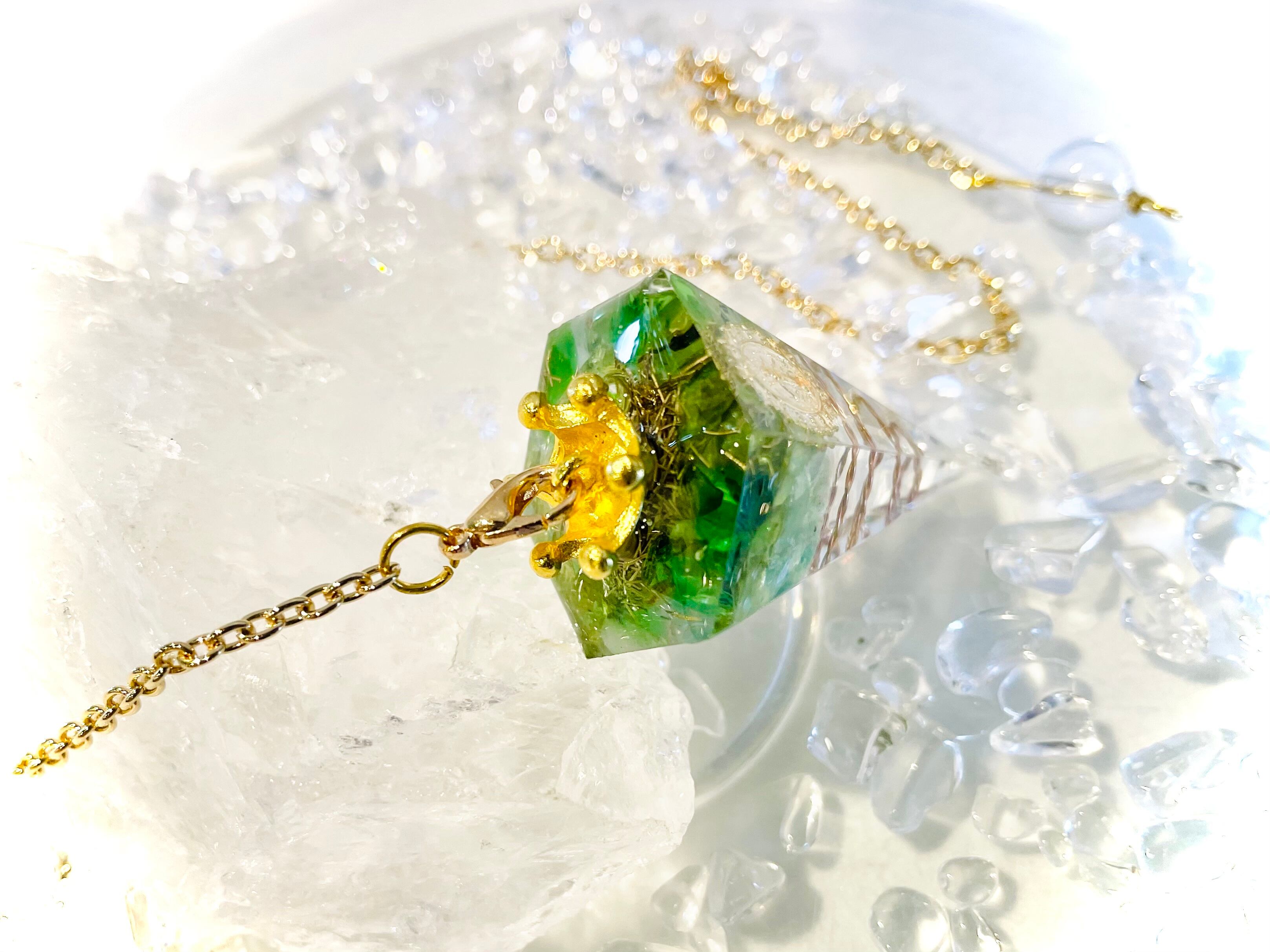 仕様と素材:レジン・螺旋状の銅線を巻いたポイント水晶・真鍮の金属片・天然石のさざれ・オーム のメダイ・専用ポーチ・オリジナルダウジングチャート・クリスタルの波動転写