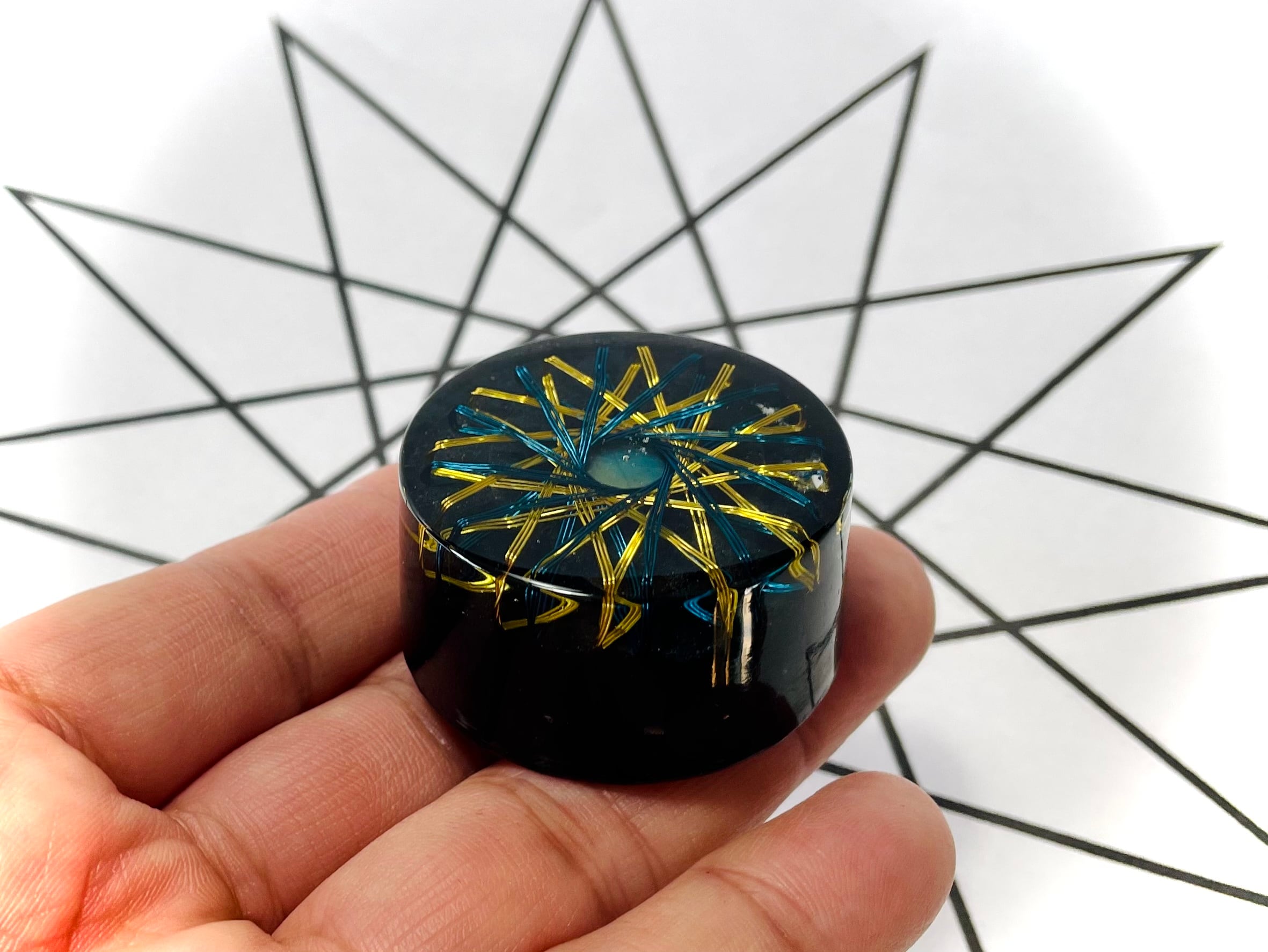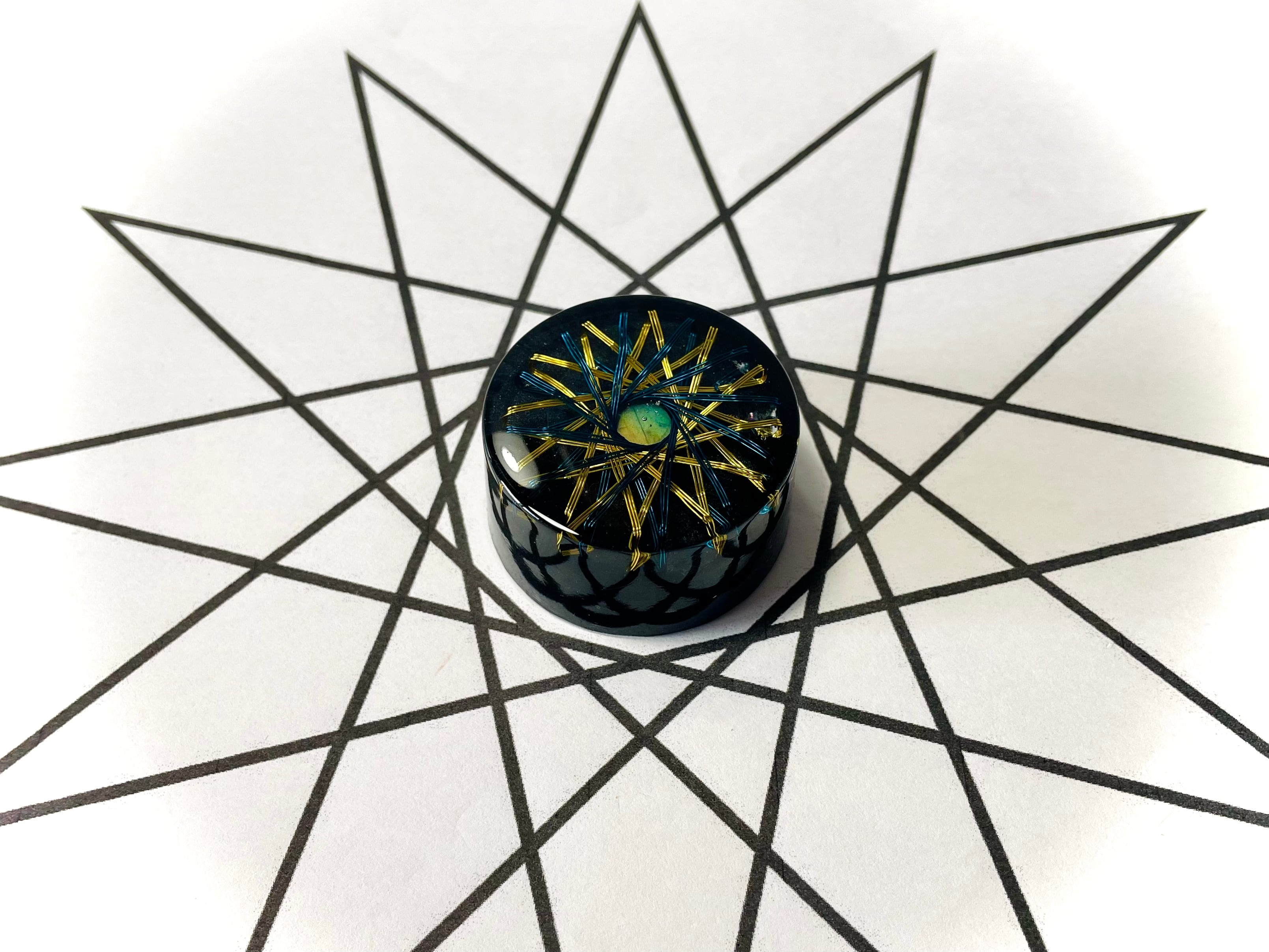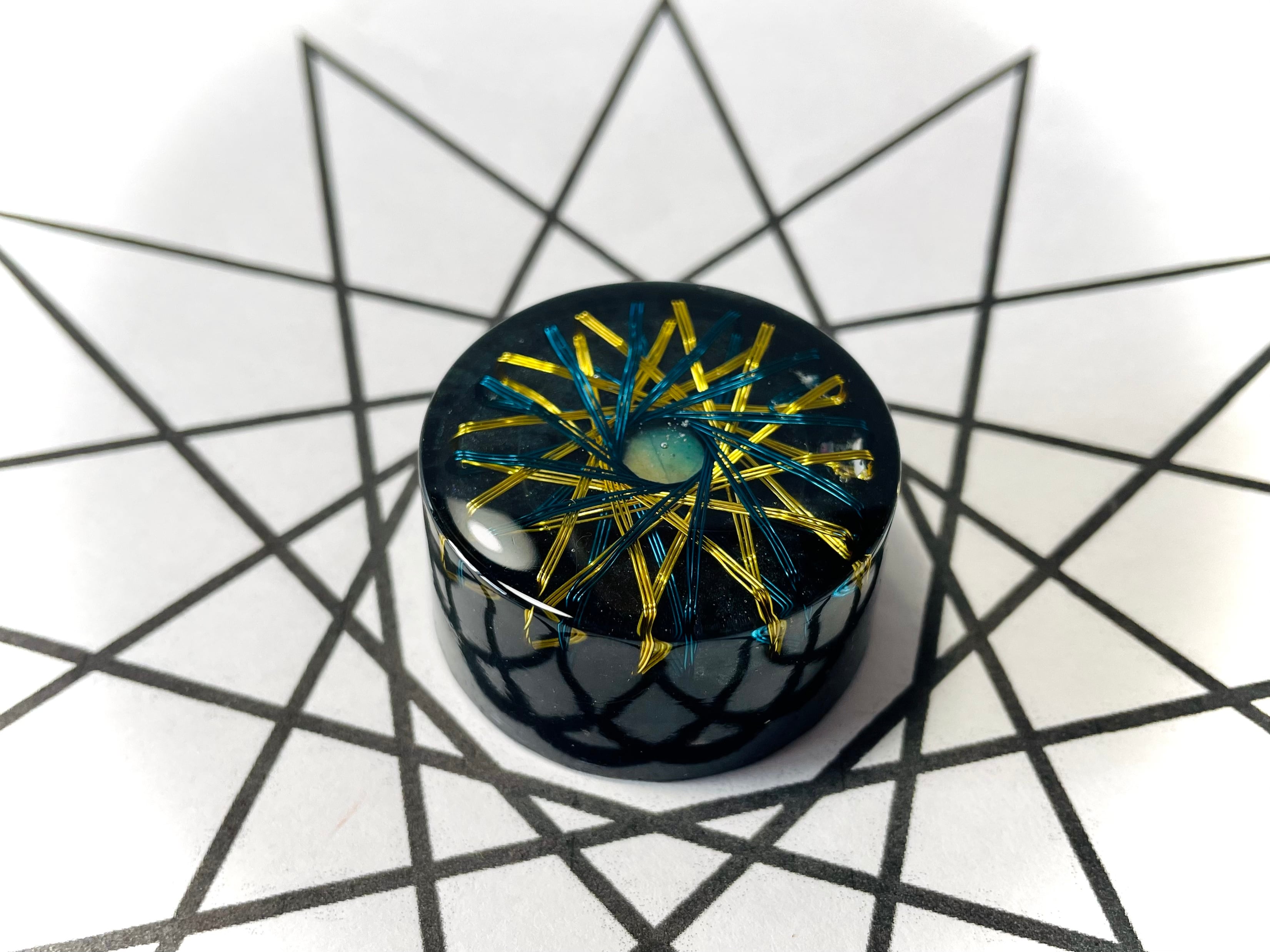 特殊な法則で十二芒星のデザインで銅線を巻くことにより、中心にトーラス状のvortexエネルギーを発生させます