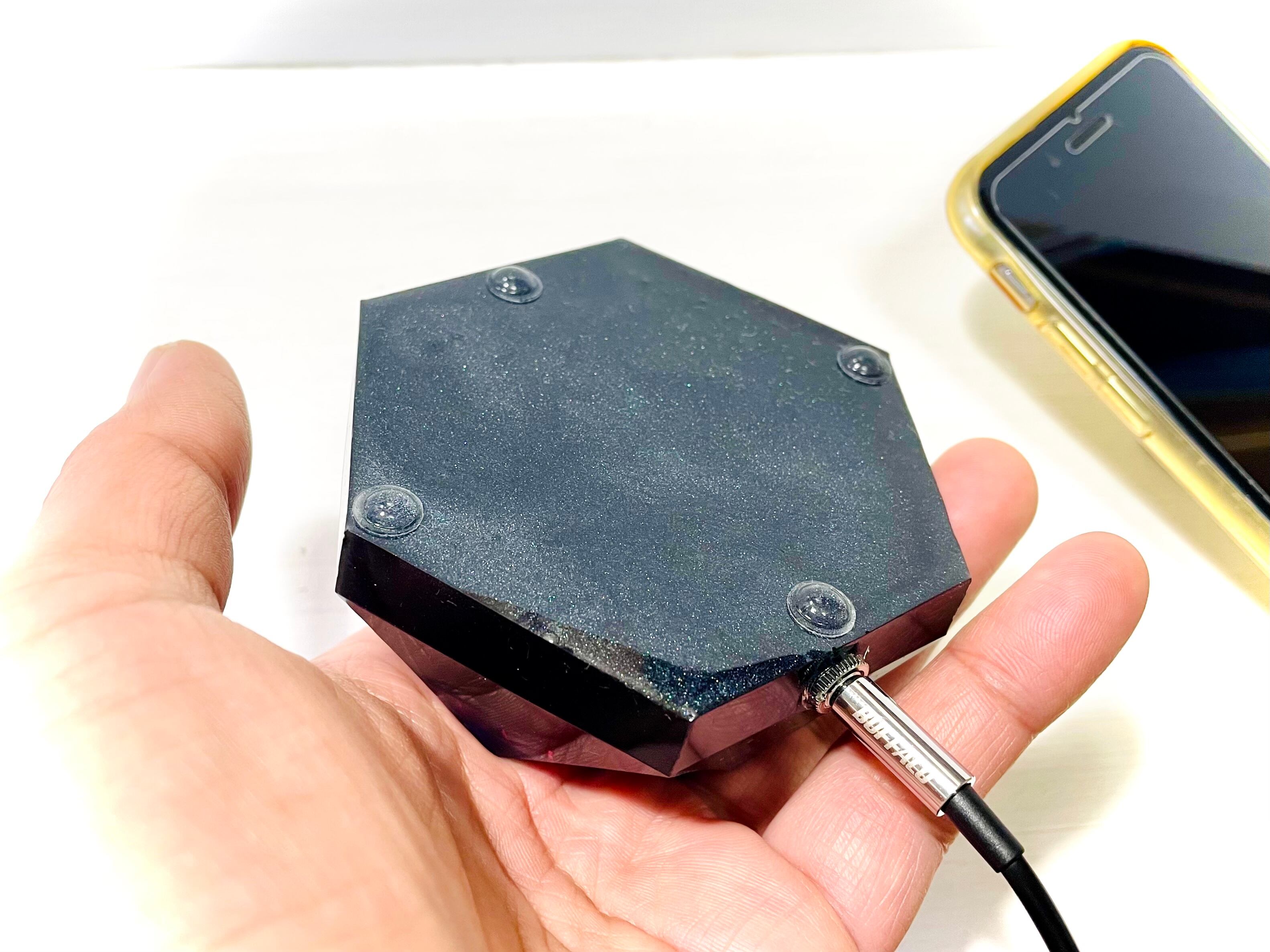 外部デバイス(スマホ)などと接続して、この中心から発生するvortexエネルギーを流すことにより、その特定の周波数の影響により、空気中の電子を整える、結果その場の氣が整うという考えで製作したものです