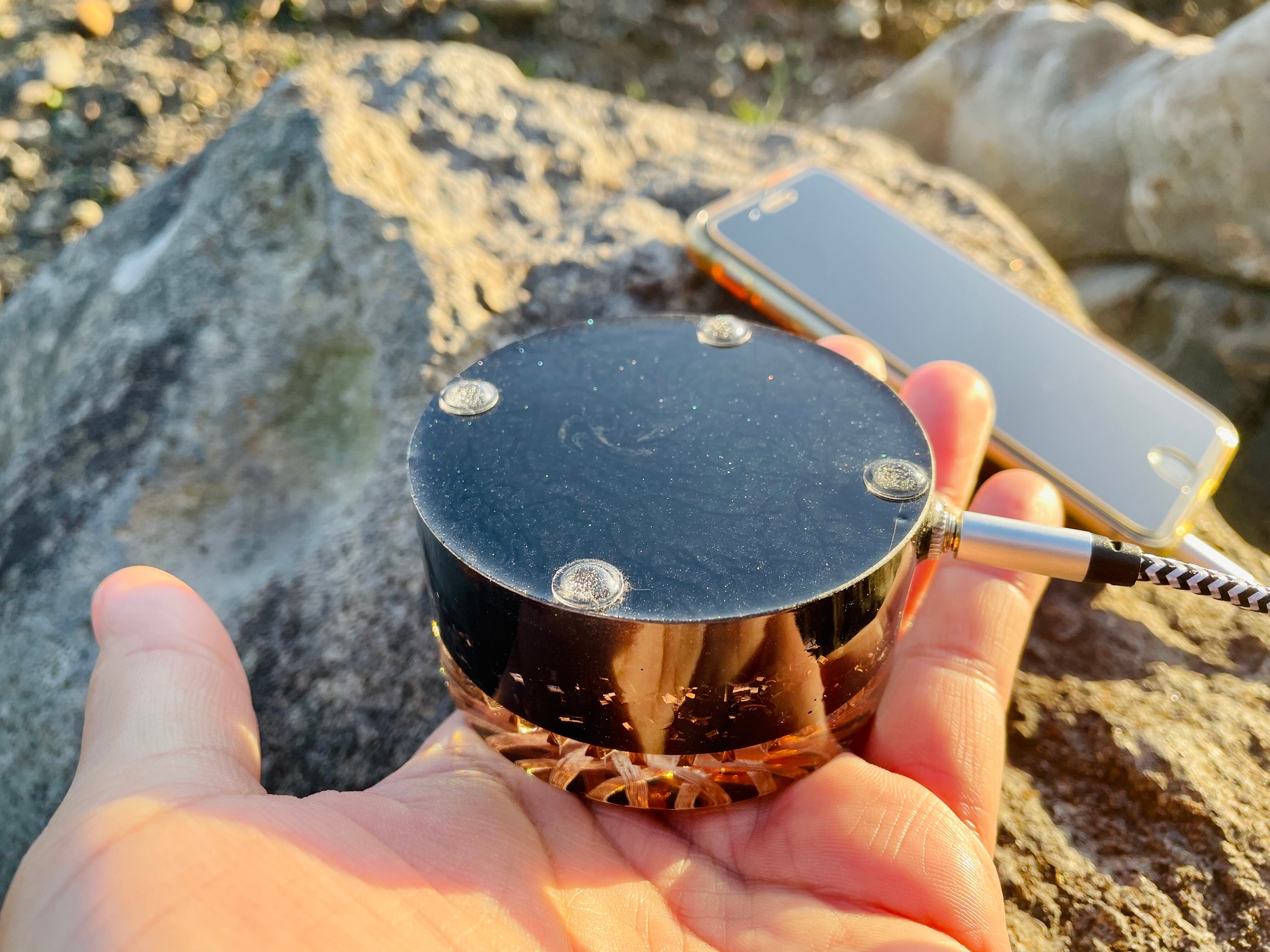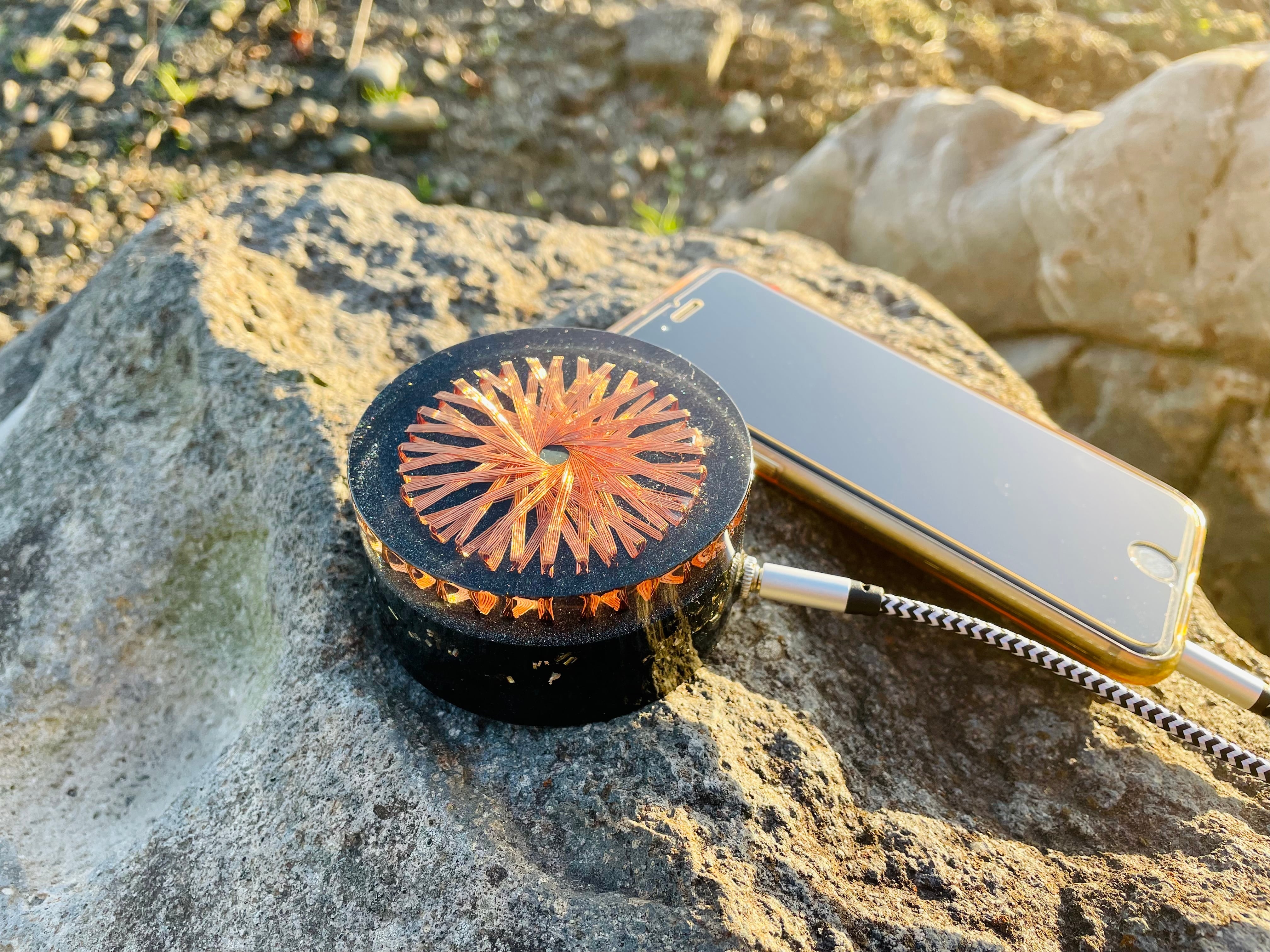 外部デバイス(スマホ)などと接続して、この中心から発生するvortexエネルギーを流すことにより、その特定の周波数の影響により、空気中の電子を整える、結果その場の氣が整うという考えで製作したものです