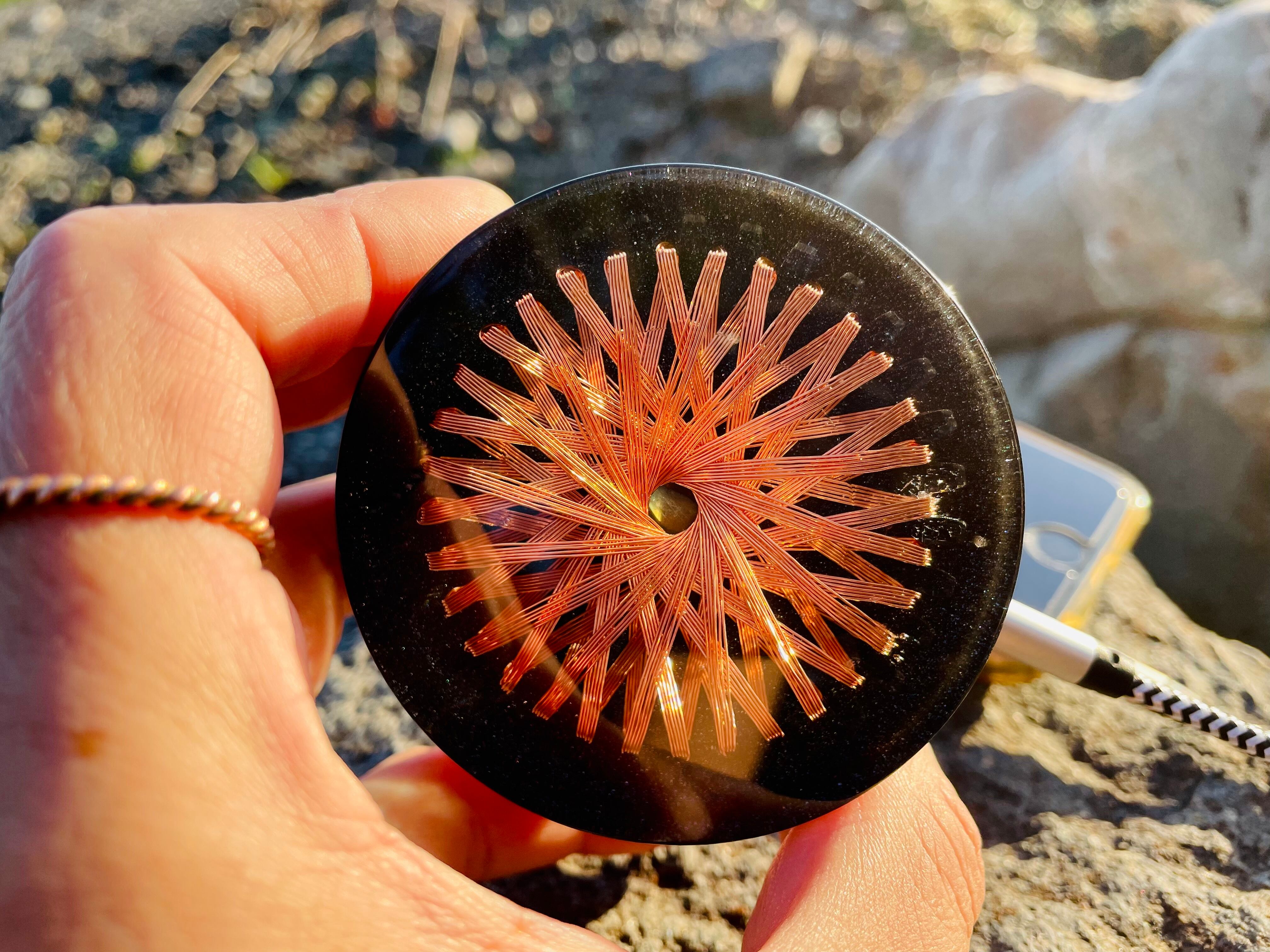 特殊な法則で十六芒星のデザインで銅線を巻くことにより、中心にトーラス状のエネルギーを発生増幅するジェネレーターとなります