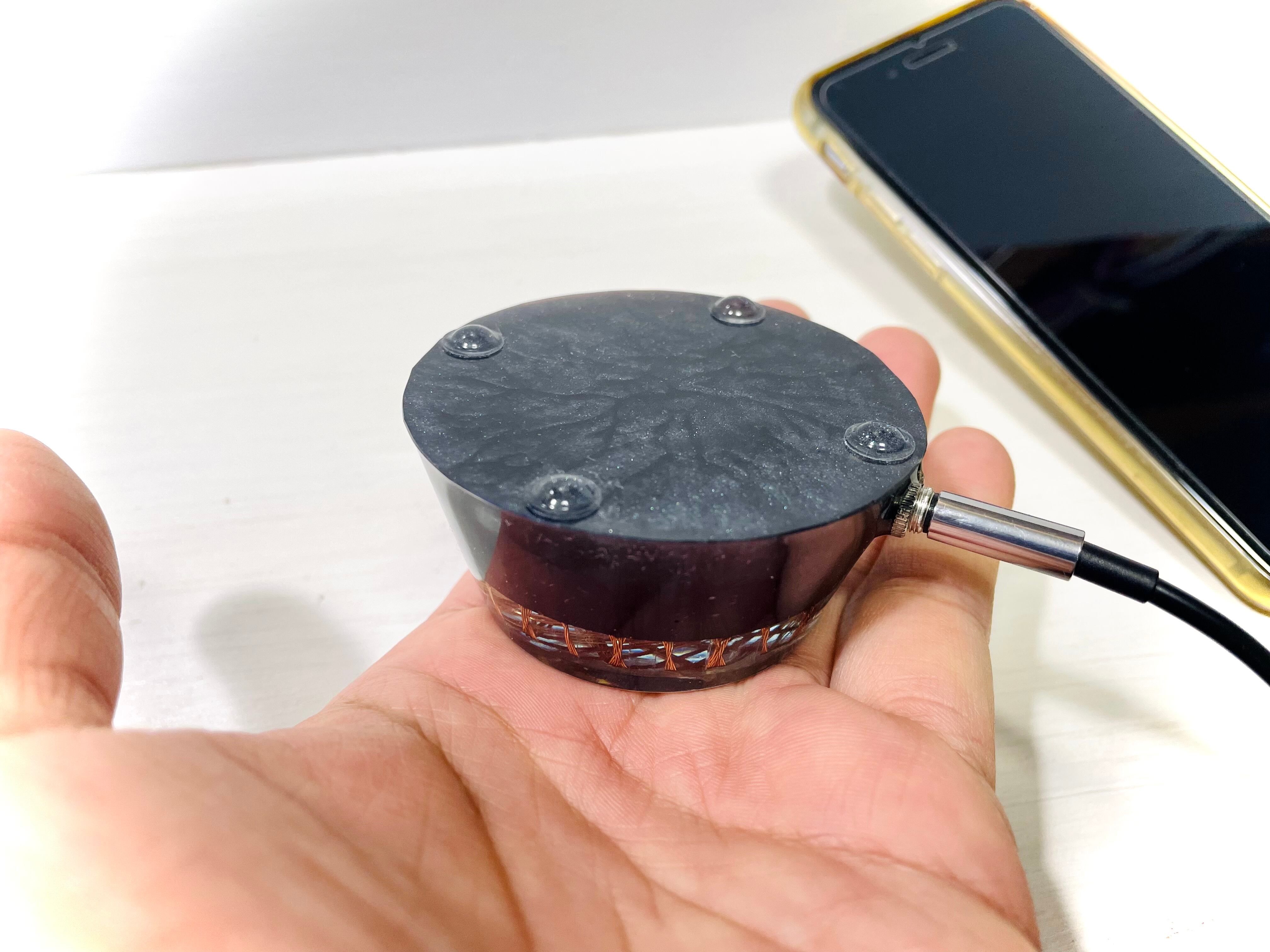 外部デバイス(スマホ)などと接続して、この中心から発生するvortexエネルギーを流すことにより、その特定の周波数の影響により、空気中の電子を整える、結果その場の氣が整うという考えで製作したものです
