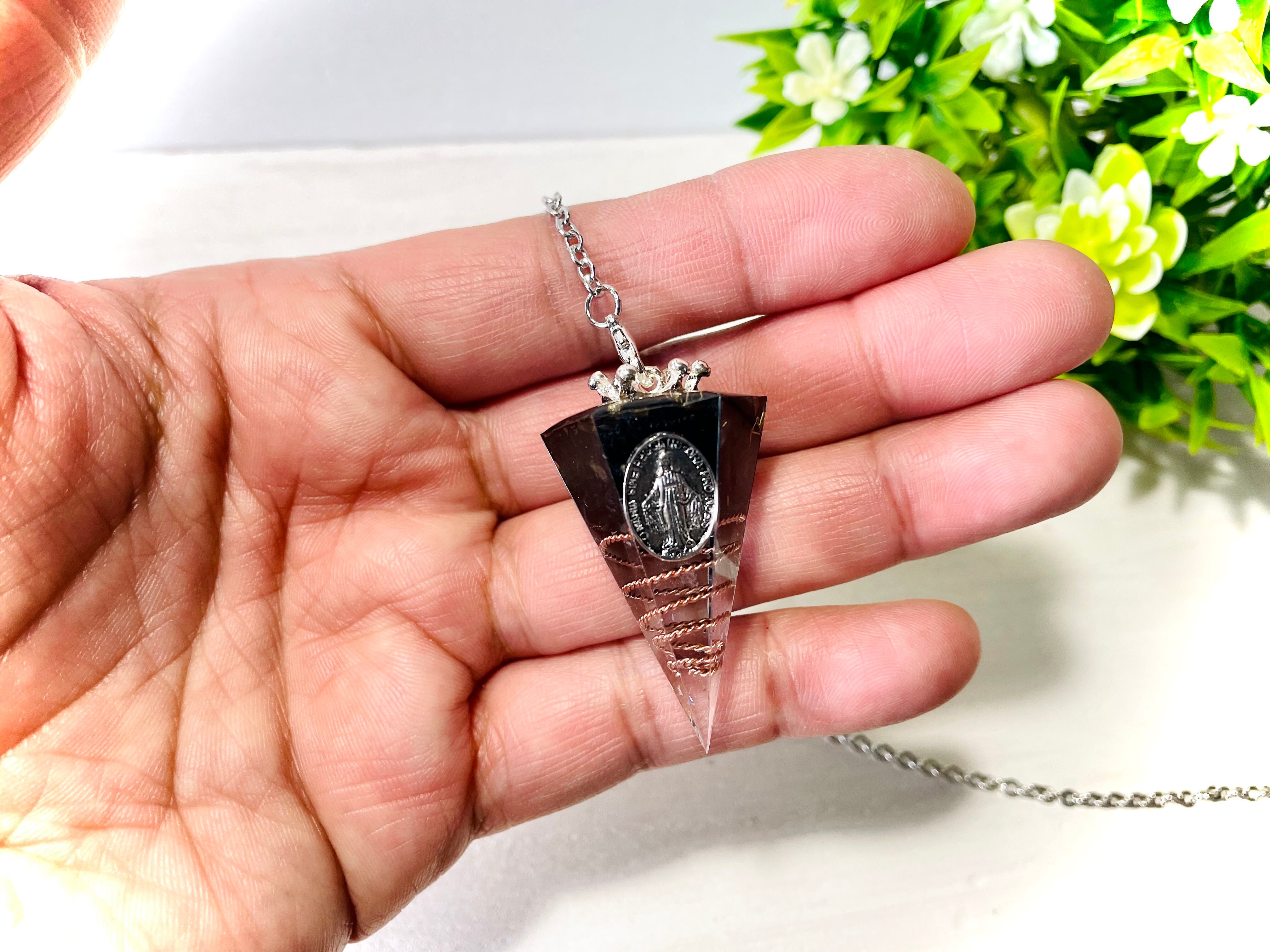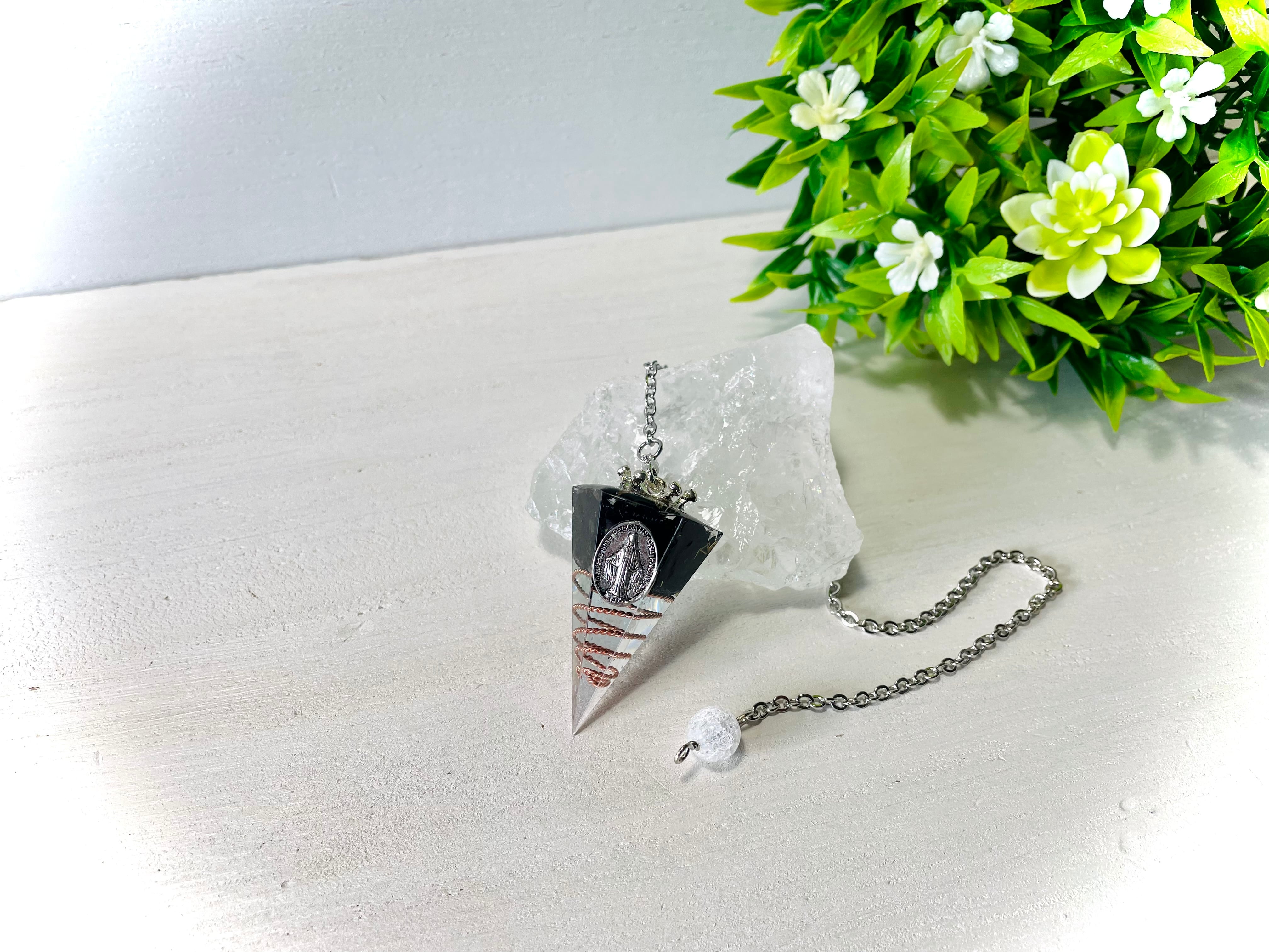 仕様と素材:レジン・螺旋状の銅線を巻いたポイント水晶・真鍮の金属片・天然石のさざれ・マリア様メダイ・専用ポーチ・オリジナルダウジングチャート・クリスタルの波動転写