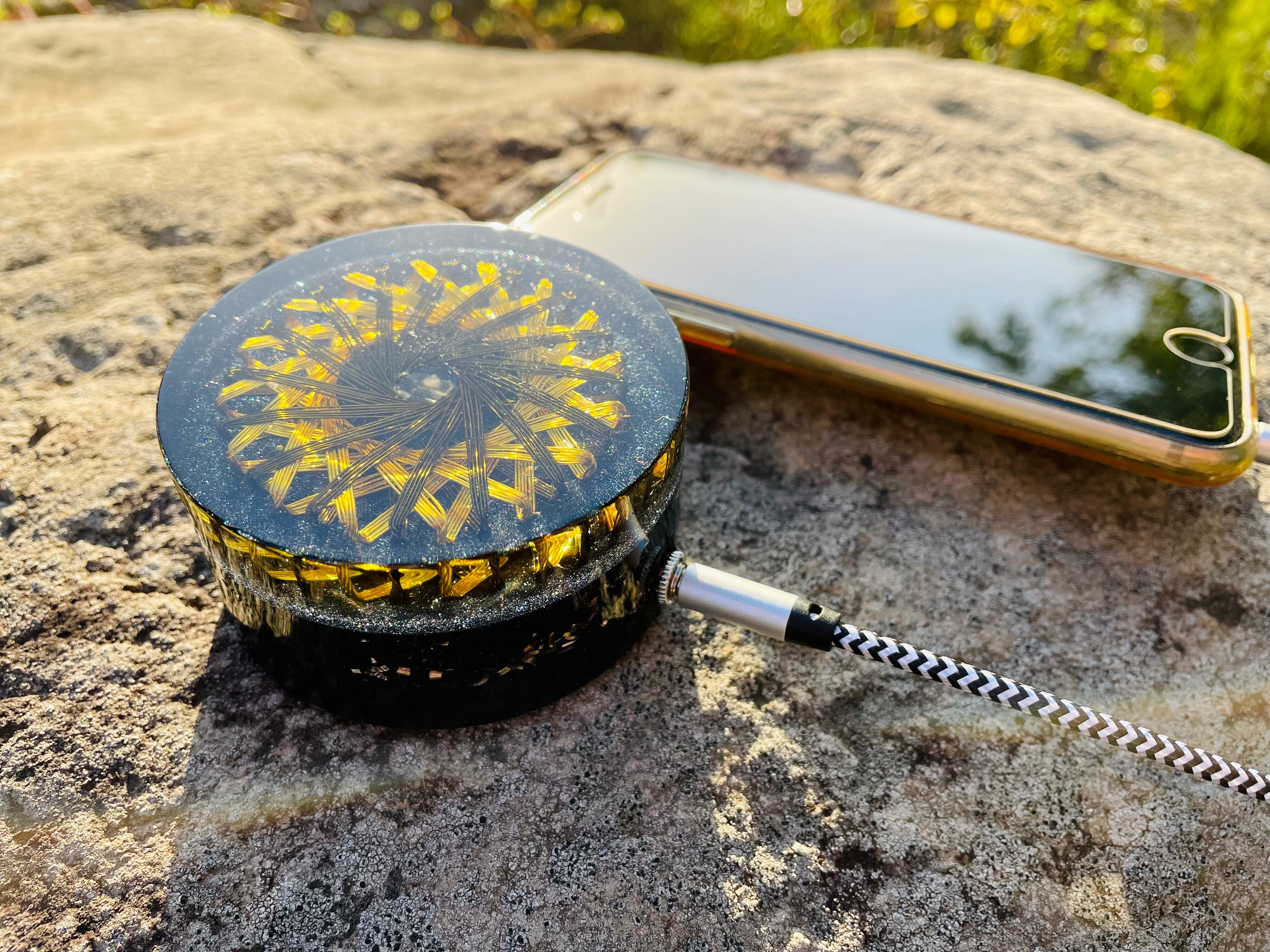 外部デバイス(スマホ)などと接続して、この中心から発生するvortexエネルギーを流すことにより、その特定の周波数の影響により、空気中の電子を整える、結果その場の氣が整うという考えで製作したものです