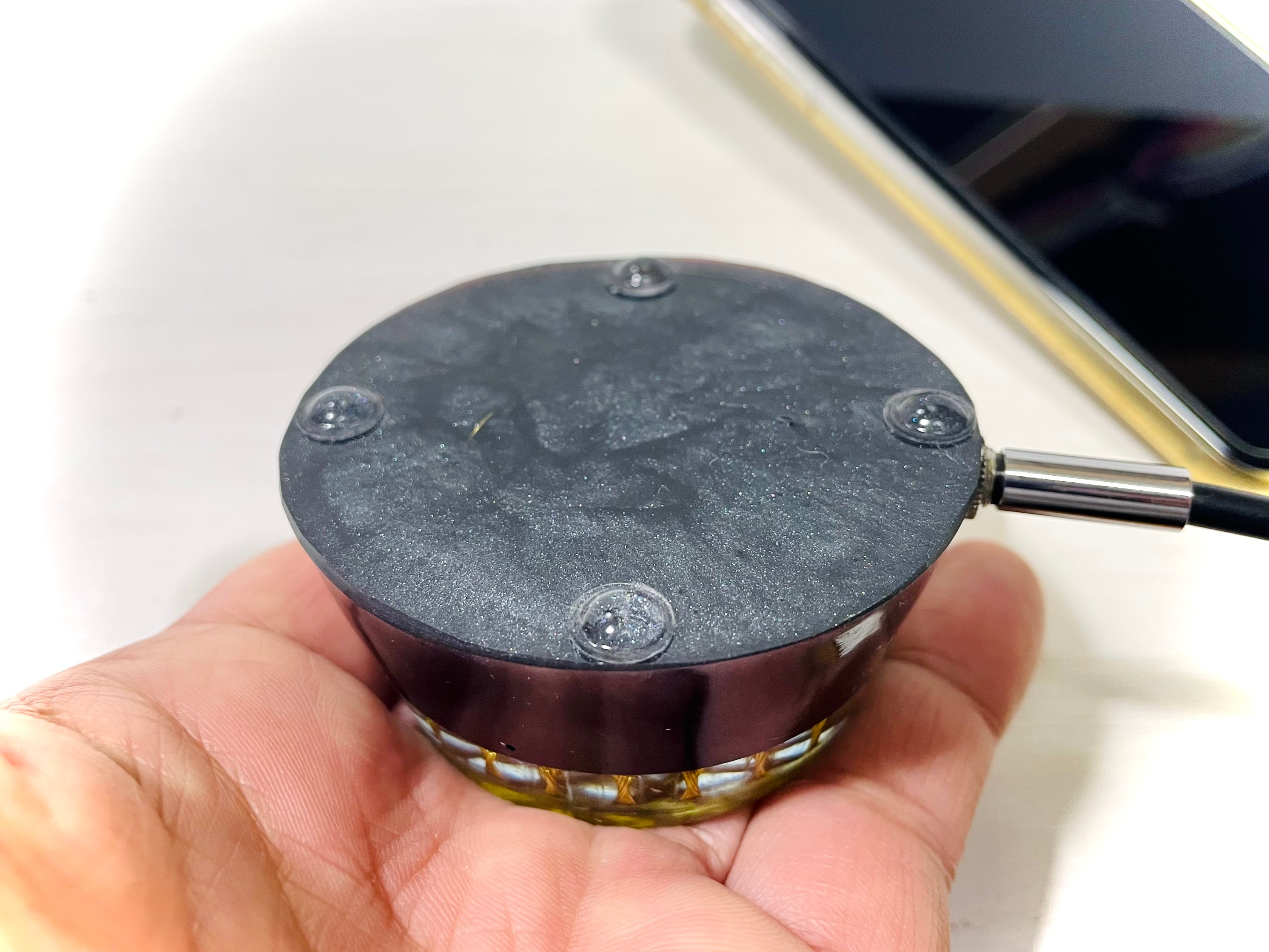 外部デバイス(スマホ)などと接続して、この中心から発生するVortexエネルギーを流すことにより、その特定の周波数の影響により、空気中の電子を整える、結果その場の氣が整うという考えで製作したものです