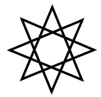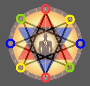 八芒星は八正道を象徴する「八角輪(ダルマチャクラ)」と重なり、悟りへの道を示す
