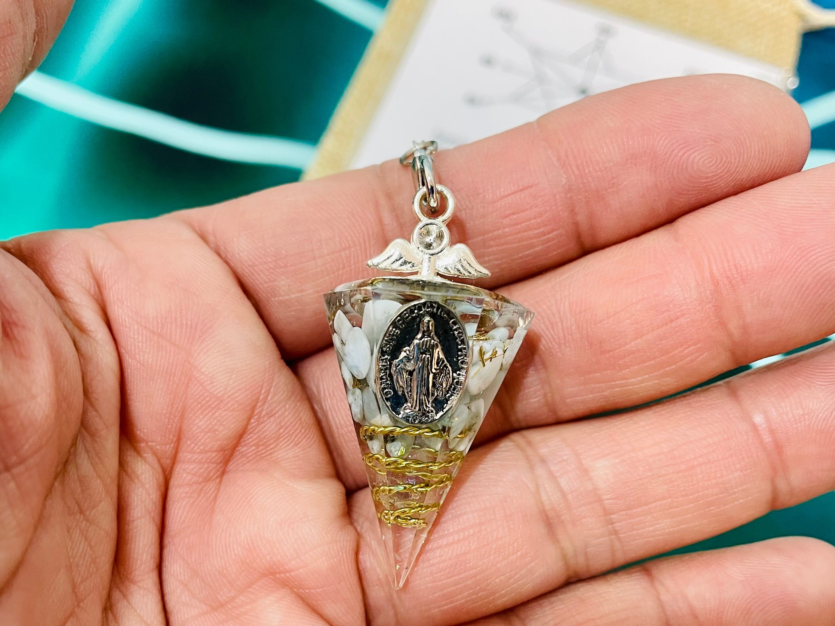 仕様と素材:レジン・螺旋状の銅線を巻いたポイント水晶・真鍮の金属片・天然石のさざれ・マリア様のメダイ・専用麻ポーチ・オリジナルダウジングチャート・クリスタルの波動転写