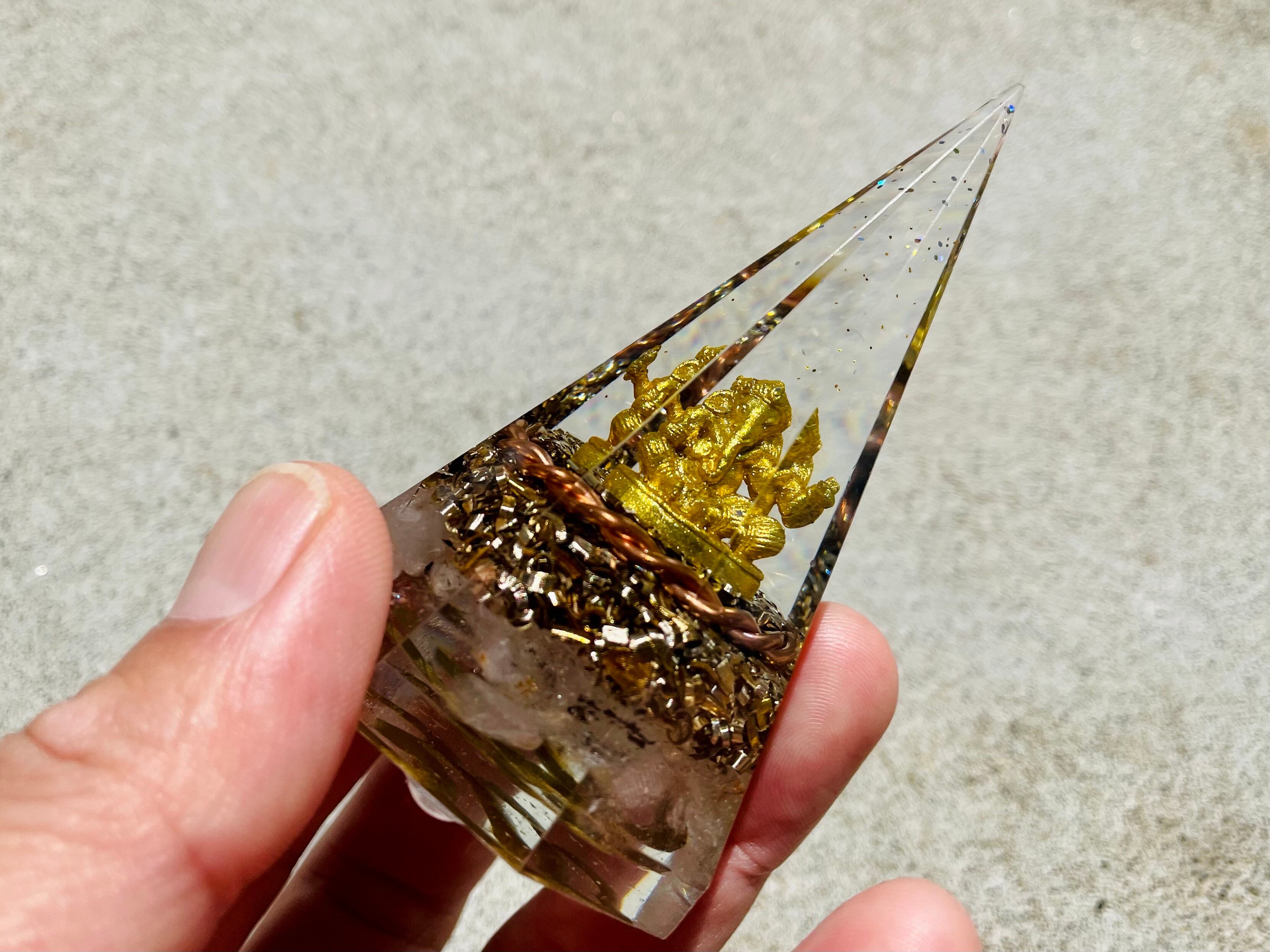 素材と仕様:レジン・ポイント水晶・銅線・真鍮金属片・ヒマラヤマニカラン水晶・オリジナルオーン図形・クリスタルの波動転写